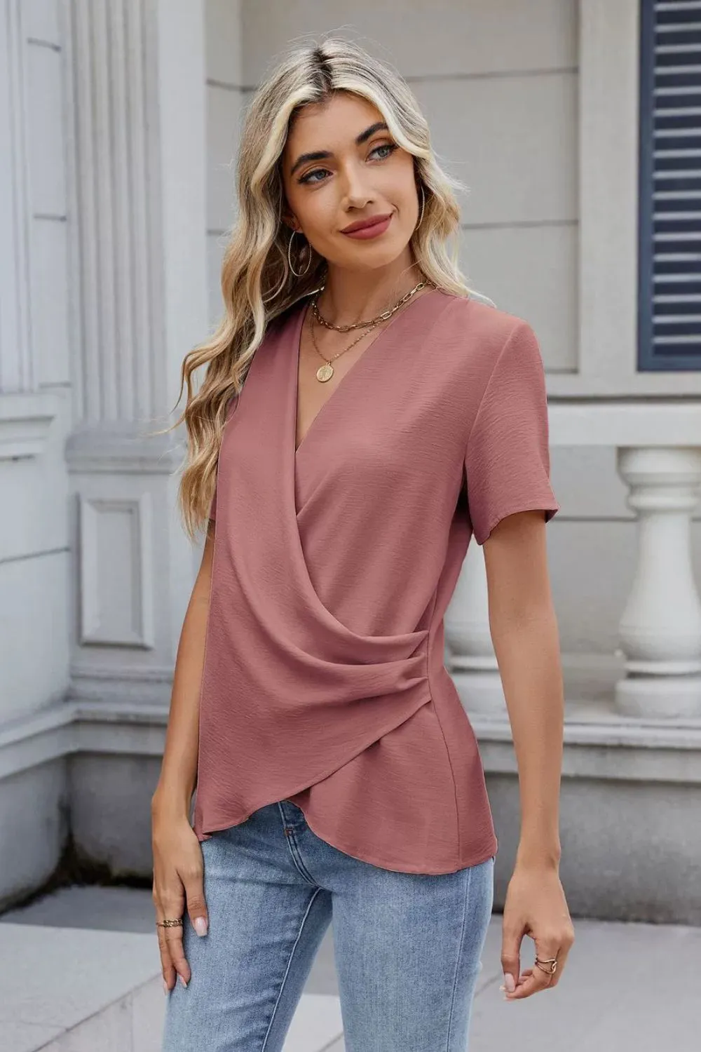Solid Color Surplice Short Sleeve Blouse
