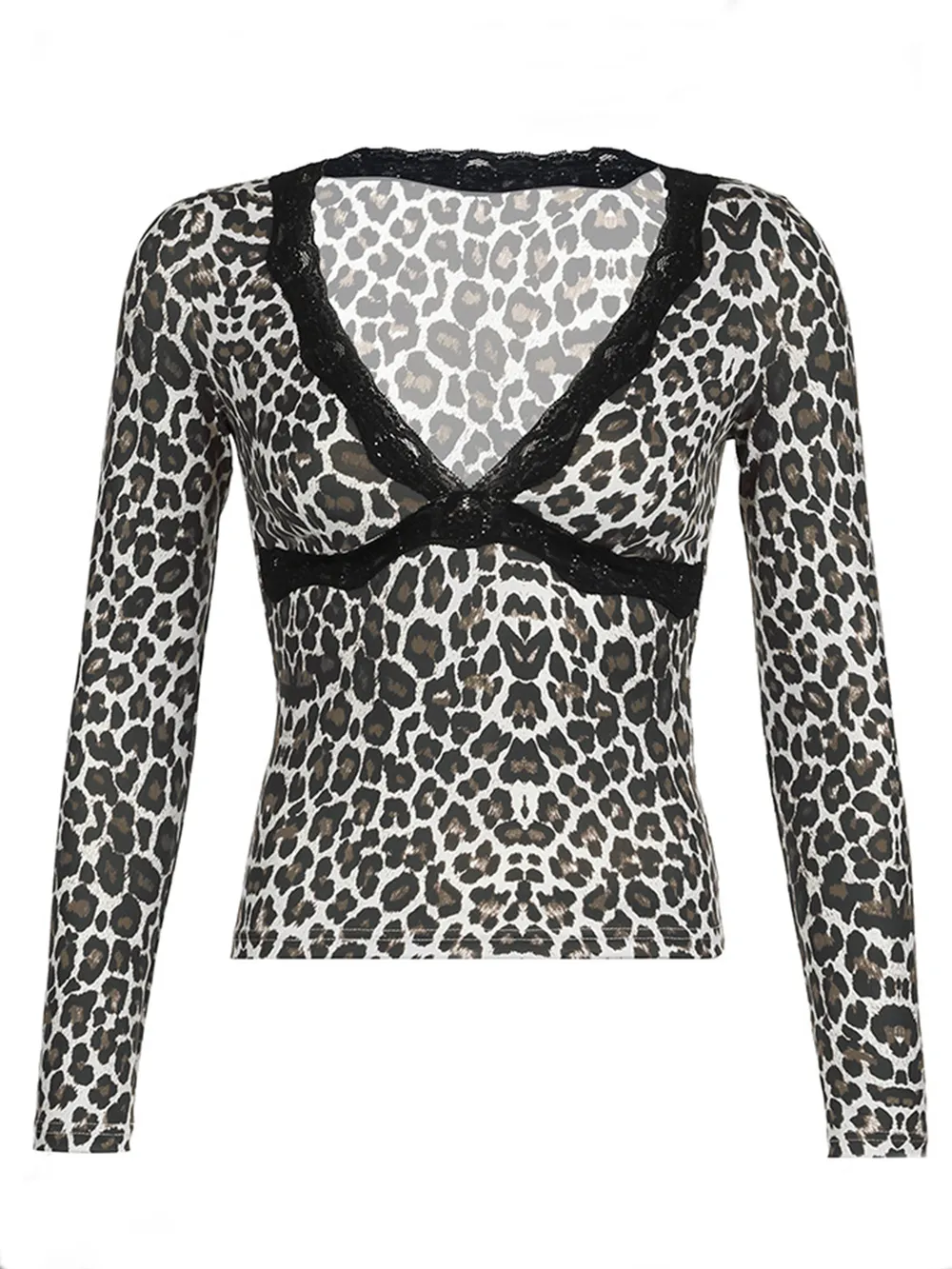 Devine Lace Detail Leopard V-Neck Long Sleeve T-Shirt