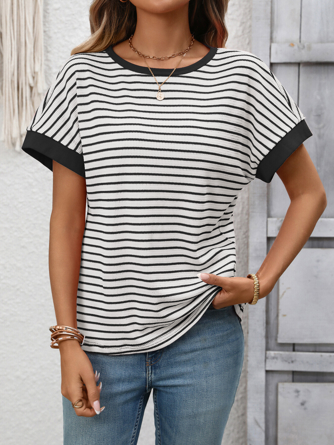 Striped Ribbed Knit Short Sleeve T-Shirt