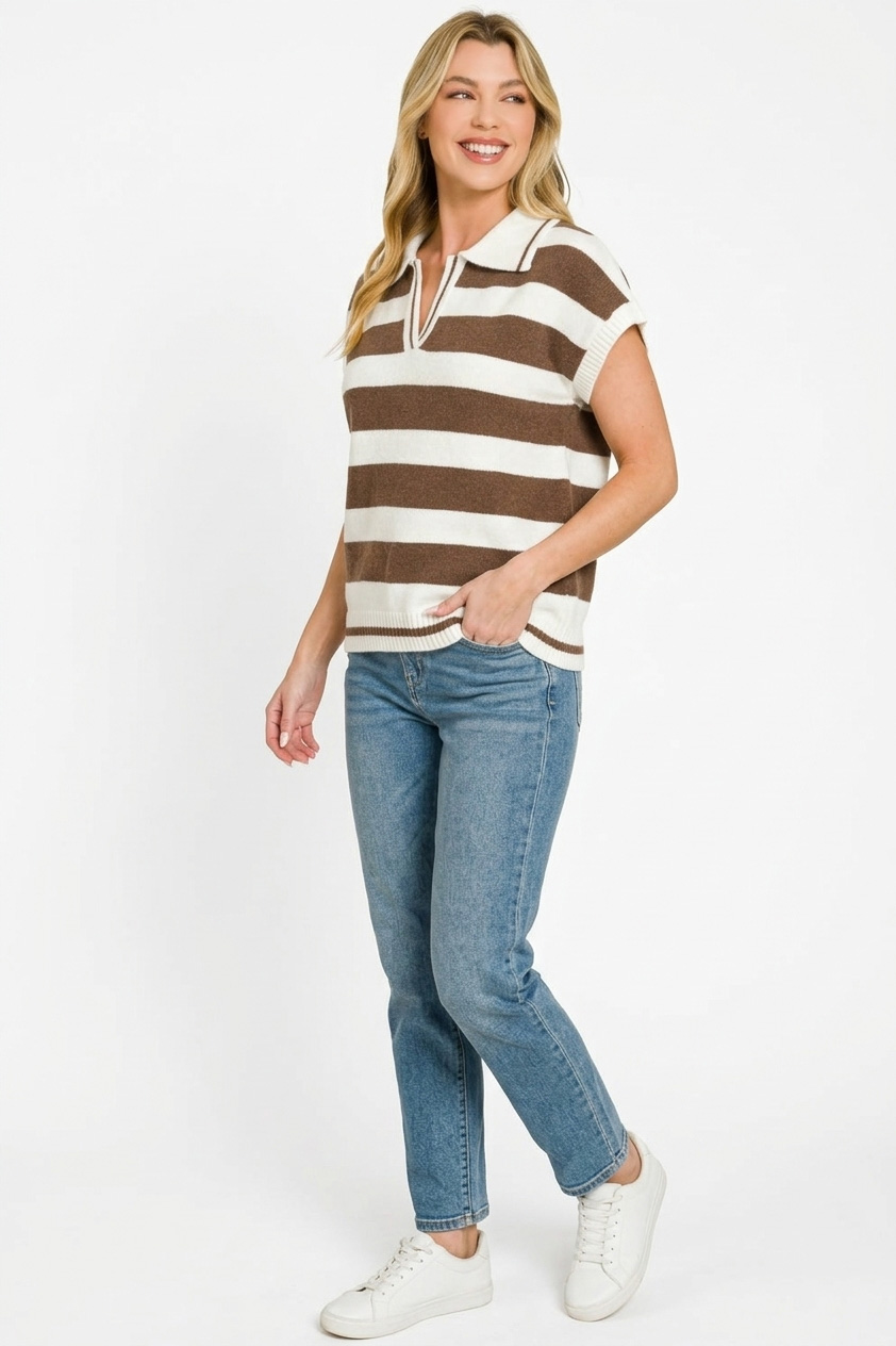Zenana Striped Collared Short Sleeve Sweater