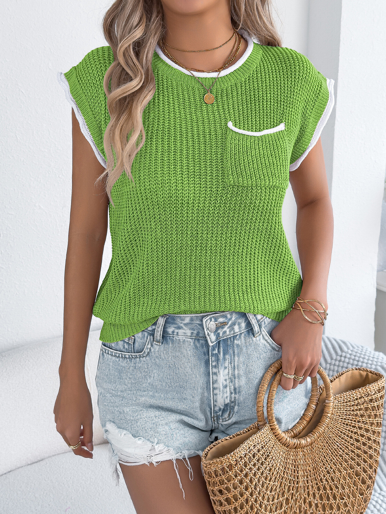 Contrast Trim Round Neck Cap Sleeve Sweater
