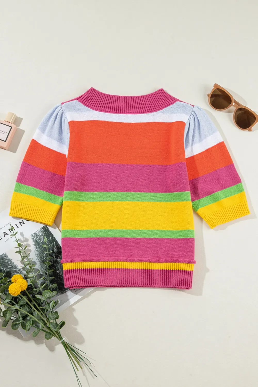 Color Block Round Neck Half Sleeve Knit Top