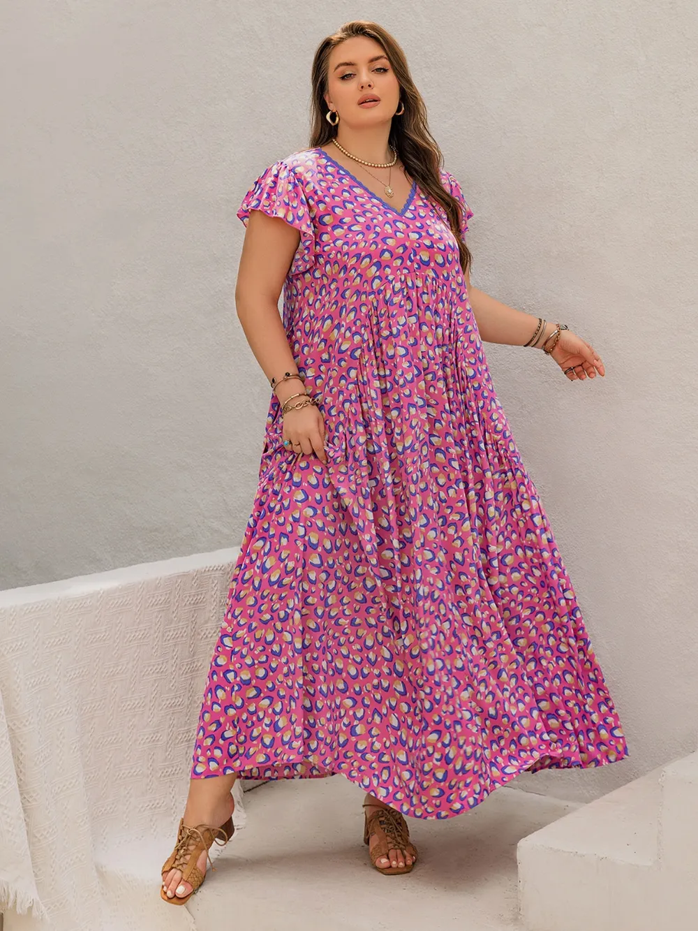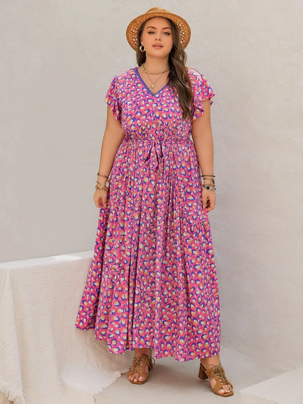 Plus Size Printed V-Neck Flutter Sleeve Tie Waist Maxi Dress