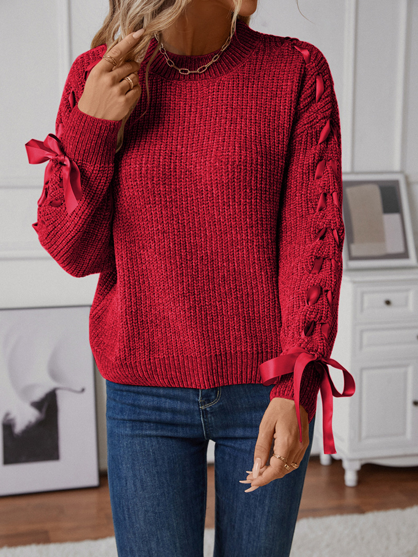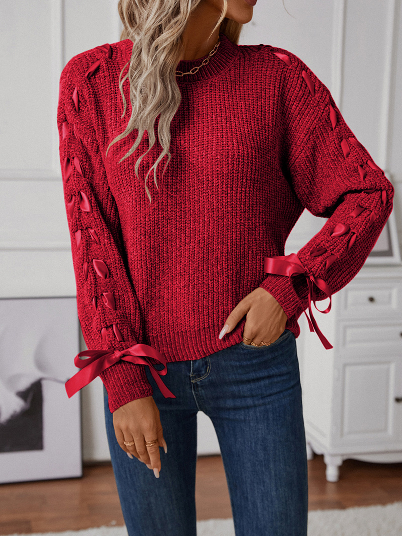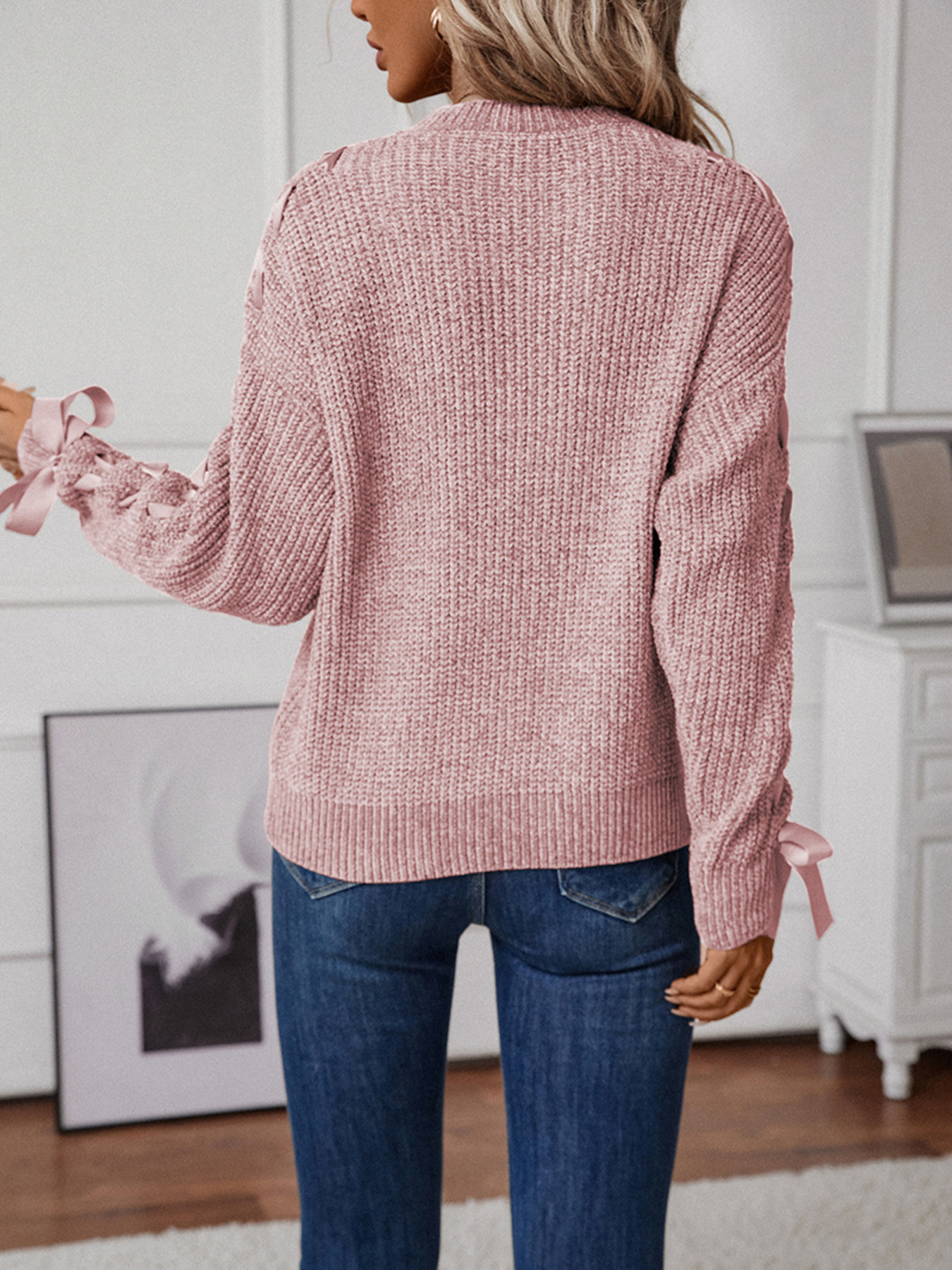 Ribbon-Tie Sleeve Round Neck Sweater