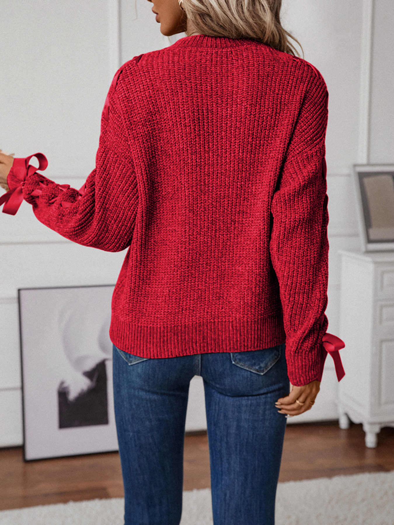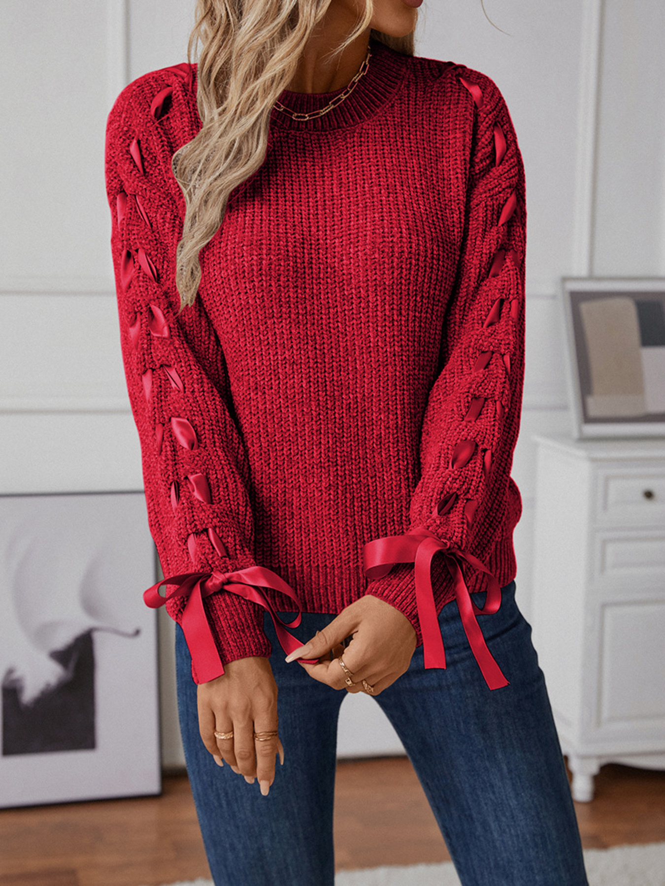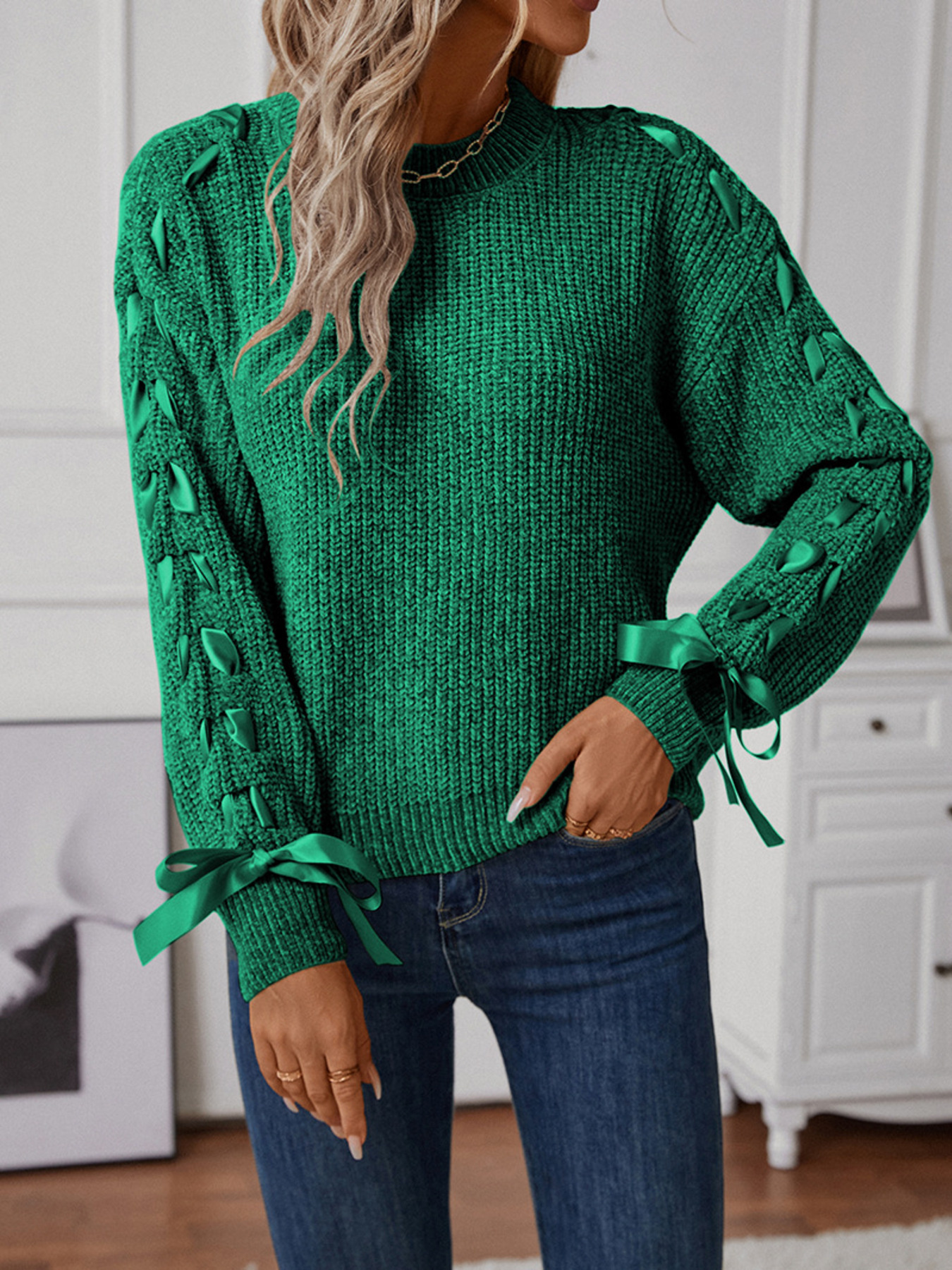 Ribbon-Tie Sleeve Round Neck Sweater