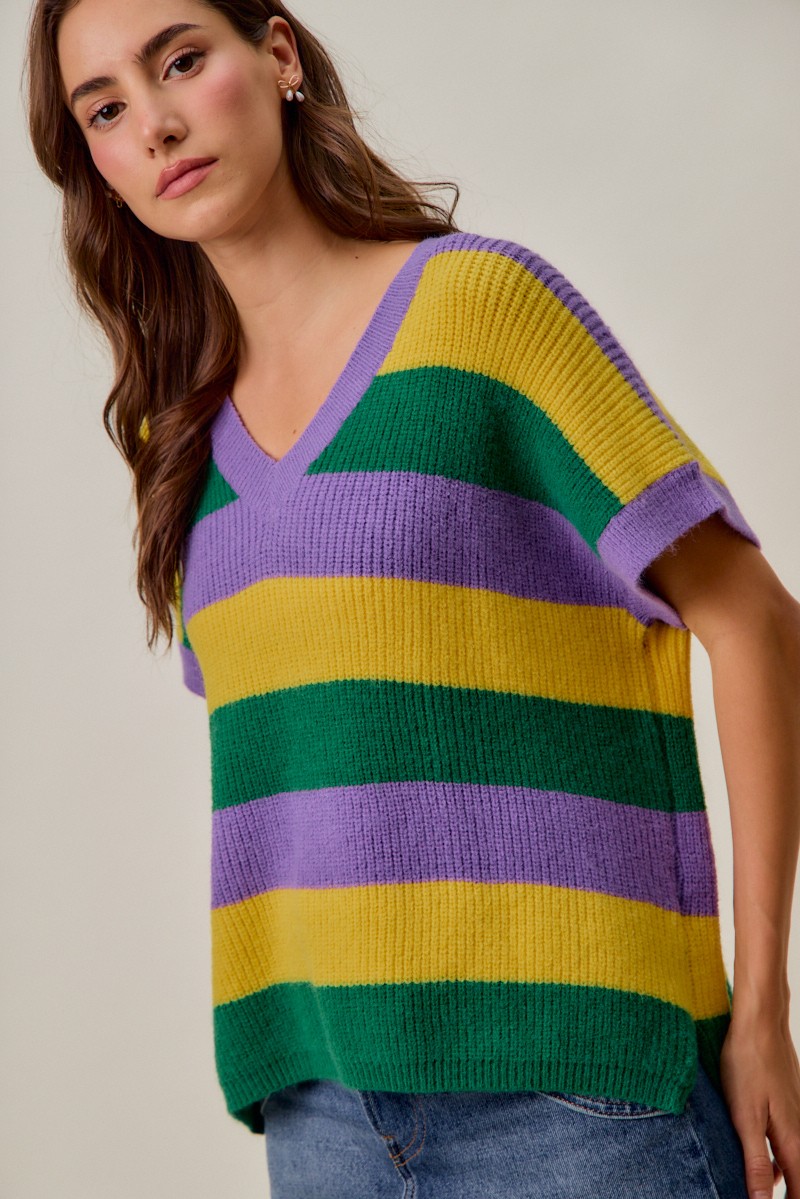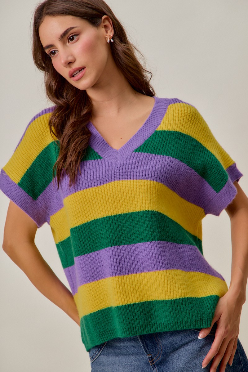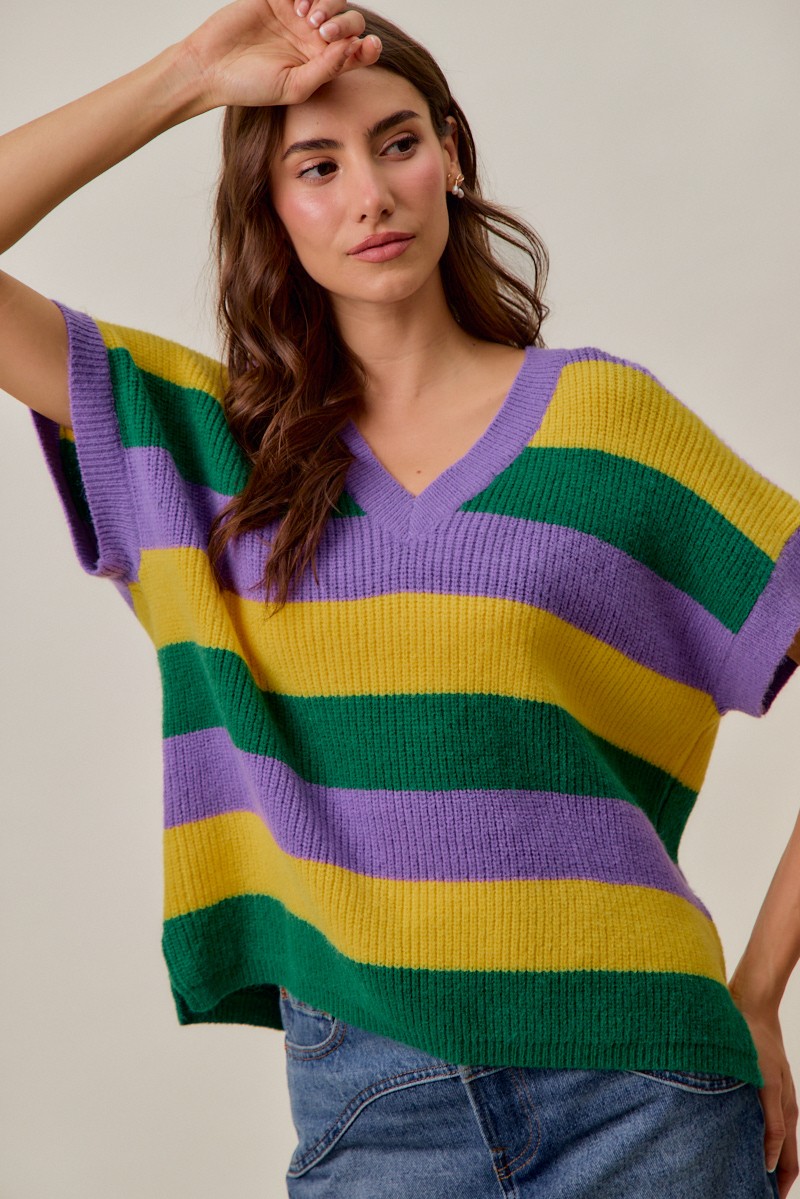 So Me Mardi Gras Loose Fit V Neck Stripe Sweater Top