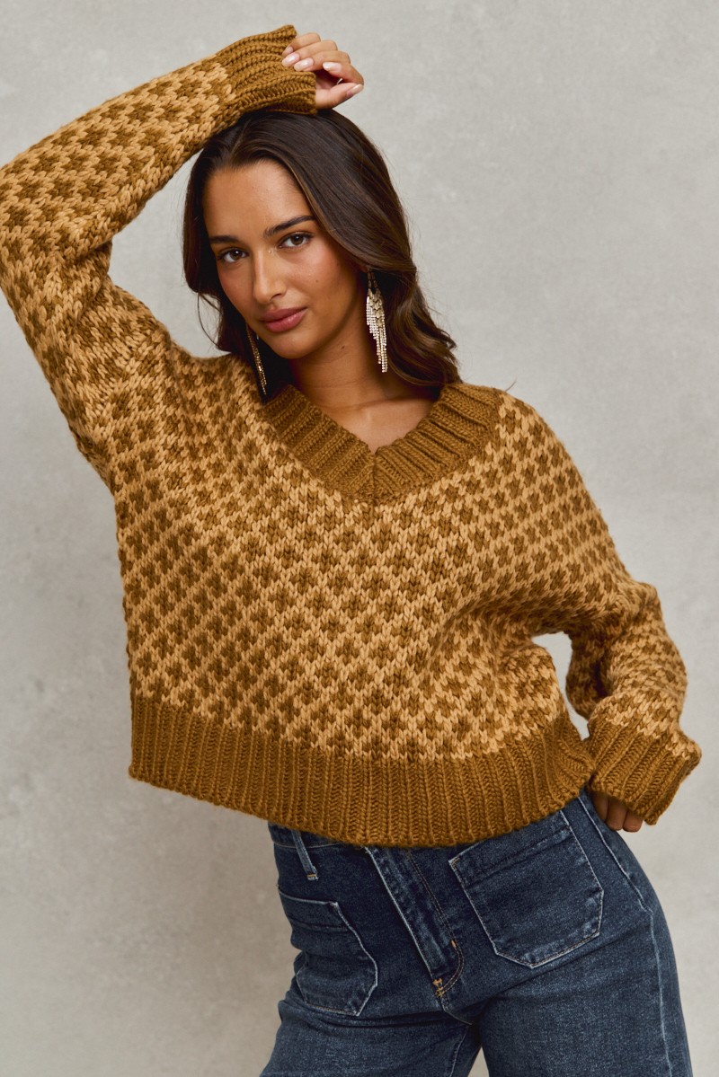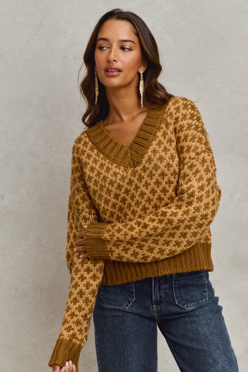So Me Color Block Textured Christmas Sweater V Neck Top