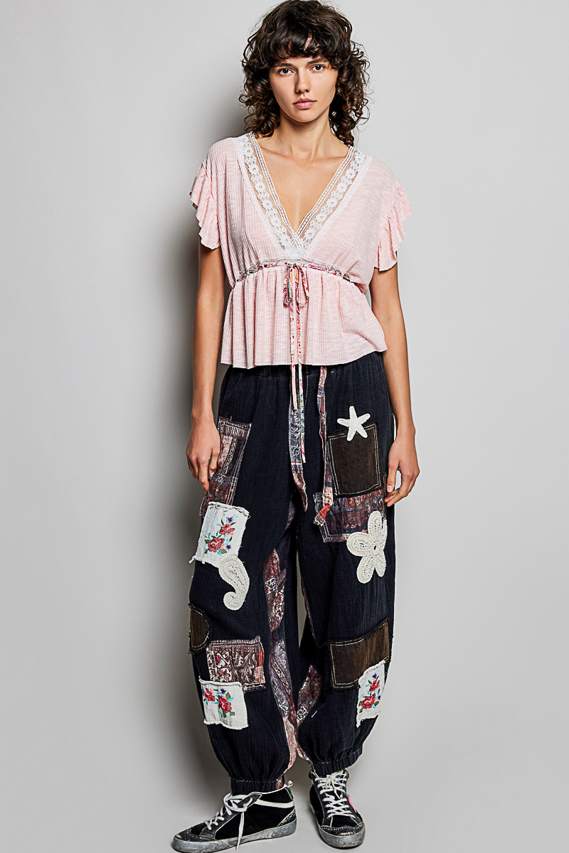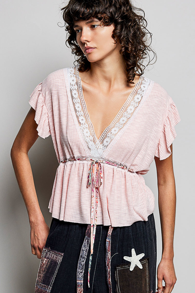 Pol Tied Ruffled V-Neck Short Sleeve Blouse With Lace Detail