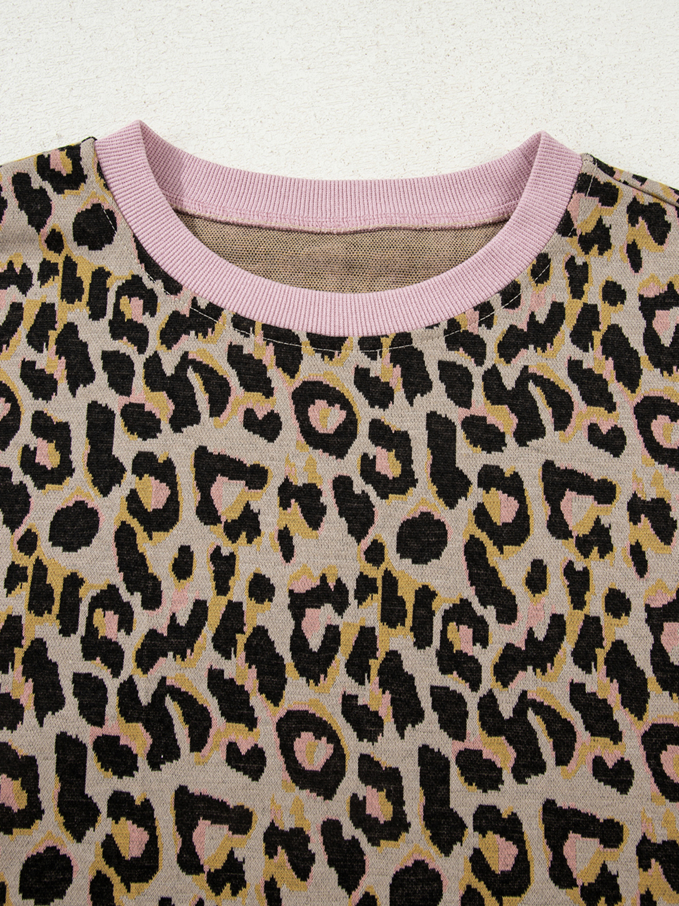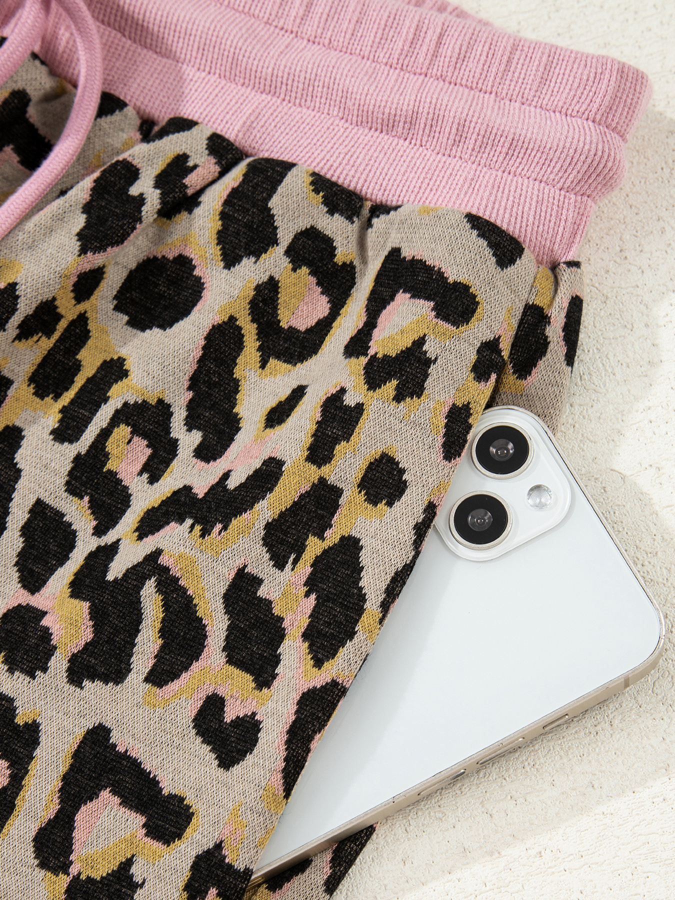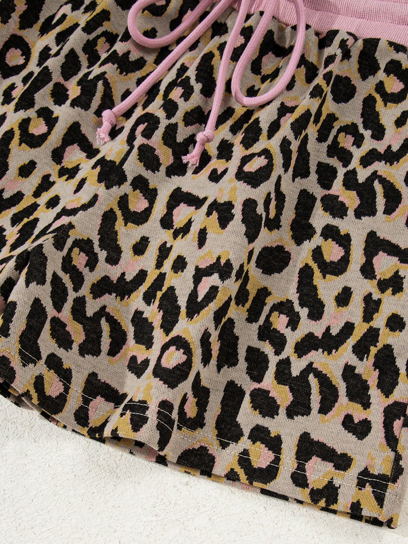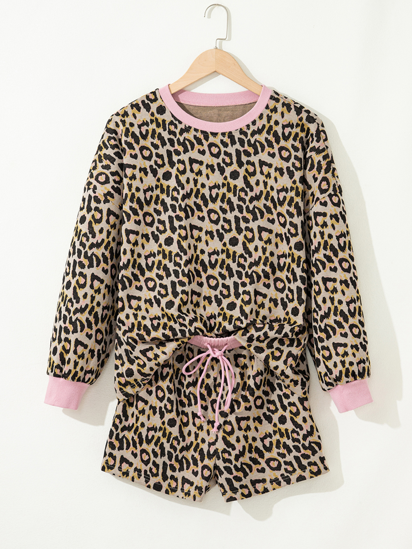 Leopard Print Contrast Edge Long Sleeve Pullover Shorts Set